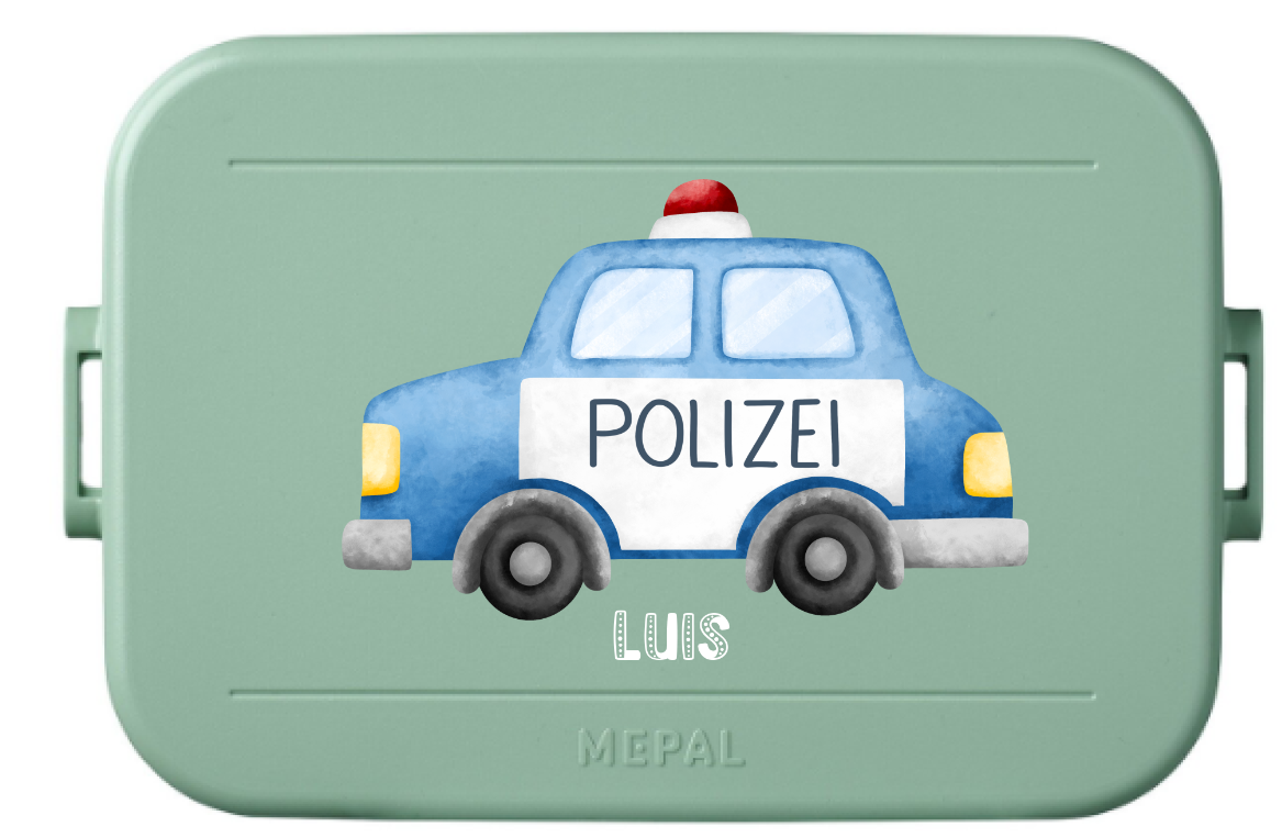 Suchst du nach einer kindgerechten Brotdose mit Bento Einsatz, die nicht nur funktional ist, sondern auch personalisiert und individuell gestaltet werden kann? Dann ist unsere personalisierte Kinder-Brotdose mit Motiv Polizeiauto die perfekte Wahl für dich!